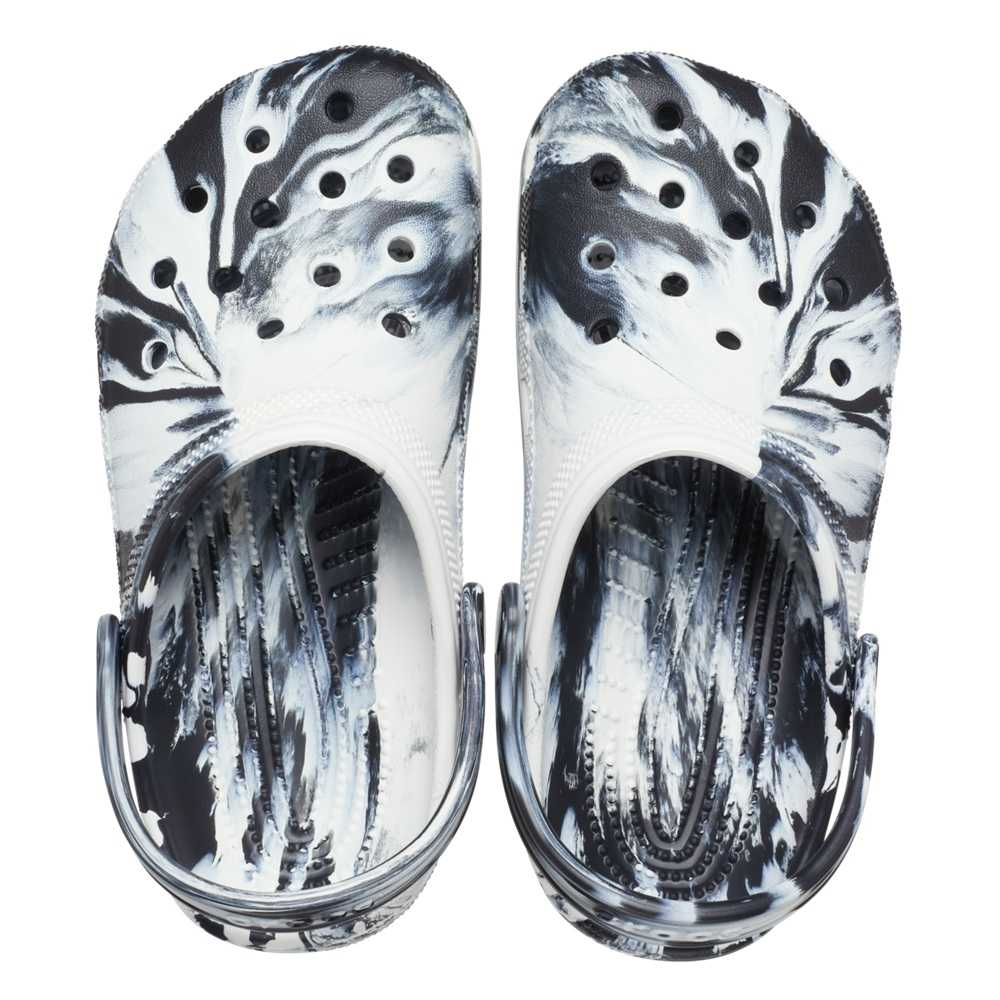 Crocs Kids Classic Marbled Clog K gyerek papucsEzeket a gyerek papucsokat márványos hatású mintázat díszíti, a gyártó klasszikus, Jibbitz díszekkel is ékesíthető szellőzőlyukakkal ellátott alapmodelljére álmodták meg a tervezők. A rugalmas és tartós CrosLite™ alapanyaga kis súlyt és hagyományos Crocs kényelmet biztosít, felhajtható sarokpántja pedig biztosan tartja a lábakat. Az ergonomikus talpágy és saroktámasz elvezeti a lépés során kialakult energiákat, csökkenti az ízületek terhelését. Belső talpán körkörösen elhelyezkedő masszírozó bütykök fokozzák a vérkeringést, harántemelő boltíve pedig egész napos kényelmet biztosít.